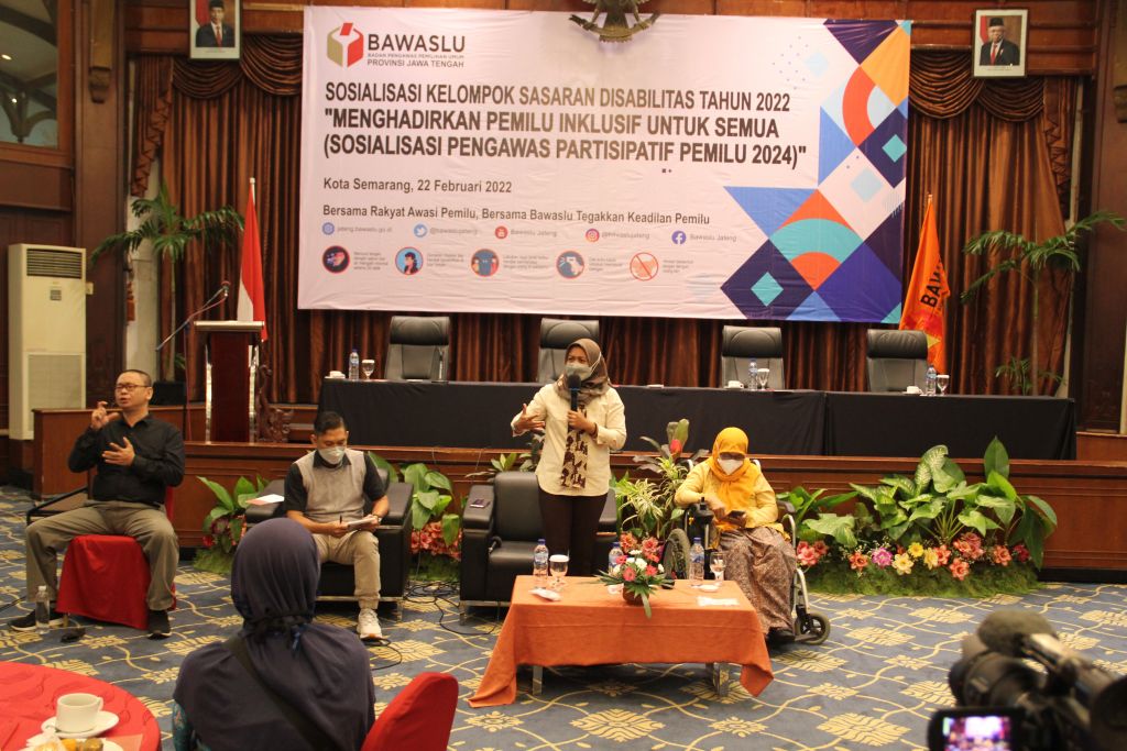 Semarang – Dalam kegiatan Sosialisasi Kelompok Sasaran Disabilitas pada senin (22 Februari 2022) Koordinator Divisi Pengawasan Bawaslu Provinsi Jawa Tengah, Anik Sholihatun menyampaikan materi tentang pemilu inklusif bagi penyandang disabilitas tahun 2024. Hal tersebut disampaikan oleh Anik dihadapan 80 peserta kegiatan yang berasal dari 16 komunitas disabilitas di Semarang bertempat di Patra Semarang Hotel & Convention. Anik menjelaskan tujuan dari pemilu inklusif kedepan adalah memudahkan para disabilitas kedepan dalam melibatkan diri di pemilu 2024.
