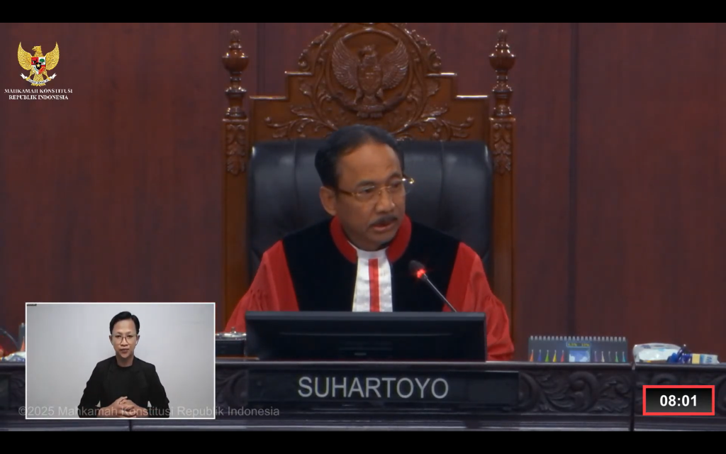 Sidang berlangsung di Ruang Sidang Utama MK RI dengan susunan majelis Hakim Suhartoyo (Ketua MK/Ketua Majelis), Saldi Isra, Anwar Usman, Arief Hidayat, Enny Nurbaningsih, Daniel Yusmic, M Guntur, Ridwan Mansyur dan Arsul Sani.