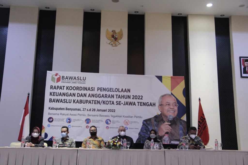 Purwokerto - Bawaslu Provinsi Jawa Tengah menyelenggarakan kegiatan Rapat Koordinasi Pengelolaan Keuangan dan Anggaran Tahun 2022 bertempat di Kantor Bawaslu Kab Banyumas pada Kamis Malam (27 Januari 2022).