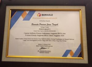 SEMARANG - Bawaslu Provinsi Jawa Tengah mendapatkan penghargaan peringkat I sebagai Bawaslu Provinsi dengan capaian indikator kinerja pelaksanaan anggaran (IKPA) dan evaluasi kinerja anggaran (EKA) tahun anggaran 2020.