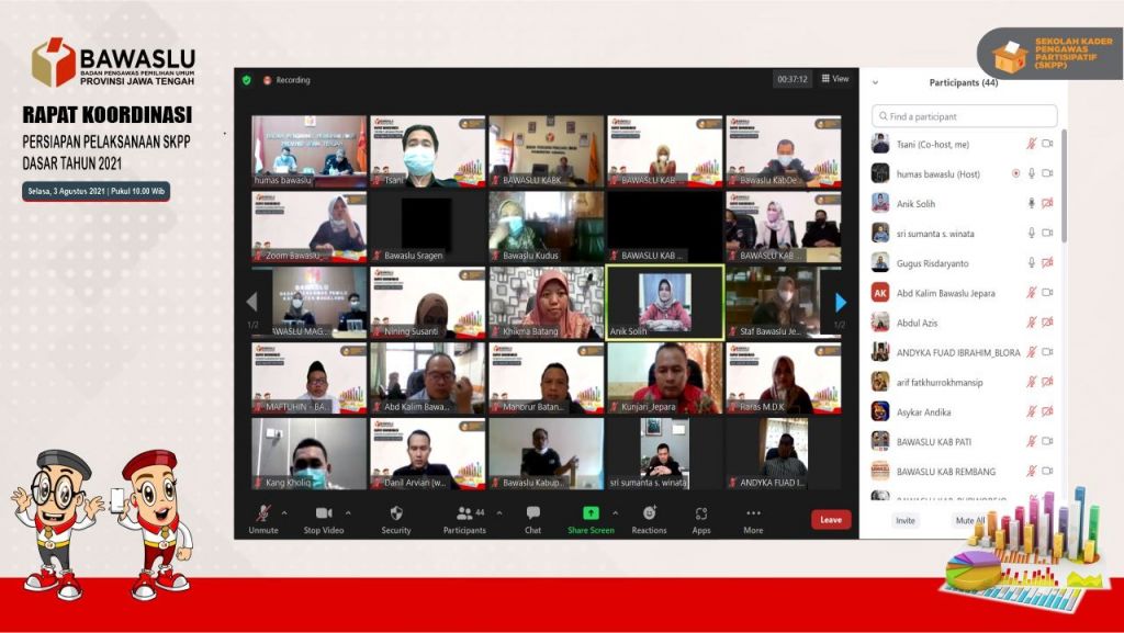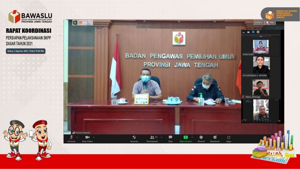 SEMARANG – Badan Pengawas Pemilihan Umum (Bawaslu) Provinsi Jawa Tengah menggelar rapat koordinasi persiapan pelaksanaan Sekolah Kader Pengawas Partisipaif (SKPP) tingkat dasar, Selasa (3 Agustus 2021). Rapat secara daring ini diikuti komisioner Bawaslu Jawa Tengah beserta 18 Kabupaten/Kota di Jawa Tengah.