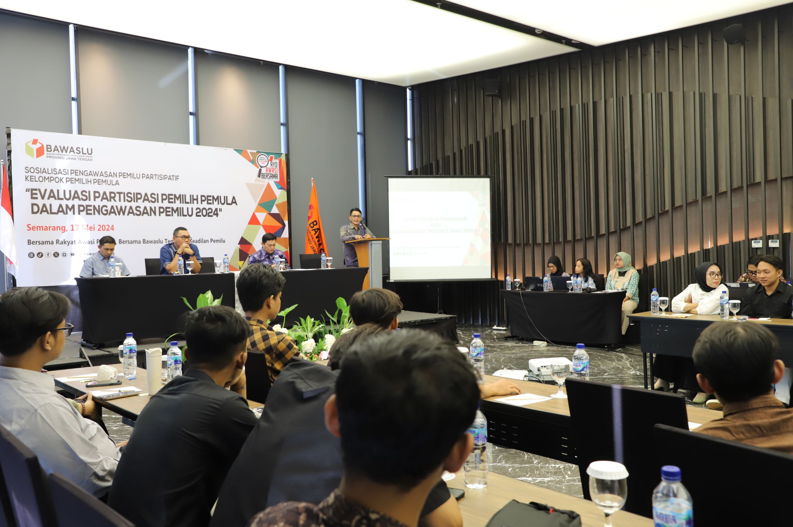 Semarang - Bawaslu Provinsi Jawa Tengah gelar Sosialisasi Pengawasan Pemilu Partisipatif Kelompok Pemilih Pemula dengan tema Evaluasi Partisipasi Pemilih Pemula dalam Pengawasan Pemilu 2024 di Hotel Aruss Semarang (17 Mei 2024).