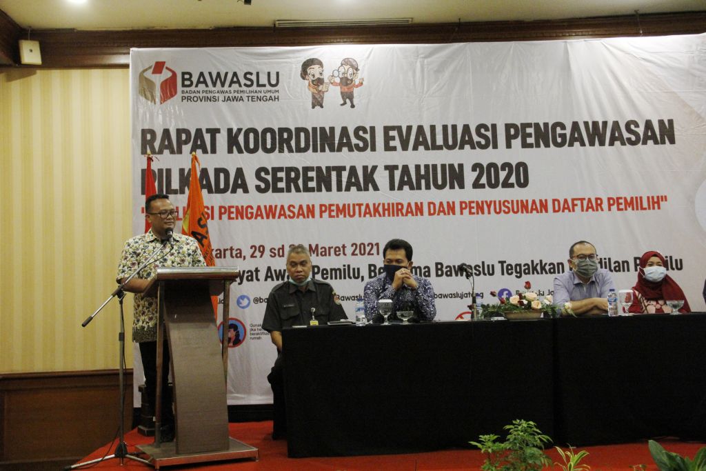 Kota Surakarta -Â Badan Pengawas Pemilihan Umum Provinsi Jawa Tengah melaksanakan kegiatan Rapat Koordinasi Evaluasi Pengawasan Pilkada Serentak Tahun 2021 dengan tema Evaluasi Pengawasan Pemuktahiran & Penyusunan Daftar Pemilih di The Sunan Hotel Solo, Senin (29 Maret 2021)