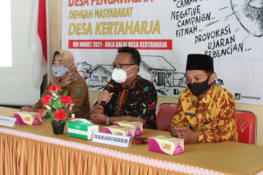Kertaharja, Bawaslu Kabupaten Tegal memberikan pendidikan politik kepada masyarakat melalui kegiatan Sosialisasi Pengawasan Partisipatif Pemilu secara tatap muka yang dikemas dalam kegiatan “Desa Pengawasan†di Desa Kertaharja pada hari Senin (8 Maret 2021)