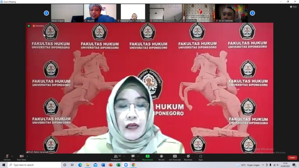 Dalam kegiatan ini hadir narasumber secara daring Prof Dr Retno Saraswati S.H., M.Hum selaku dekan Fakultas Hukum Undip dan Dr Edi Pranoto S.H., M.Hum selaku dosen Fakultas Hukum UNTAG Semarang.