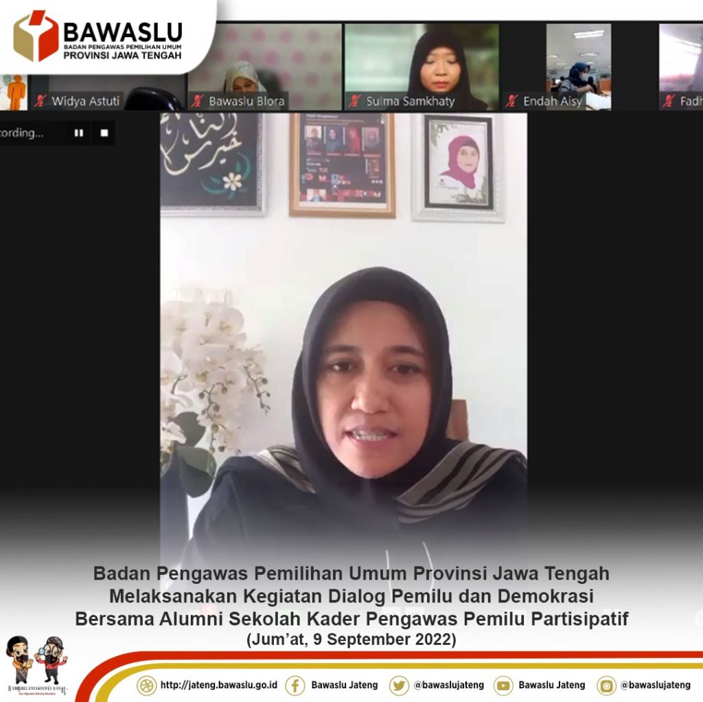 Semarang – Badan Pengawas Pemilihan Umum Provinsi Jawa Tengah melaksanakan kegiatan dialog pemilu dan demokrasi bersama para kader SKPP (Sekolah Kader Pengawas Partisipatif) Jumat, 9 September 2022 secara daring. Terdapat 81 peserta hadir yang terdiri dari alumni SKPP tahun 2021, 2020 hingga 2021.