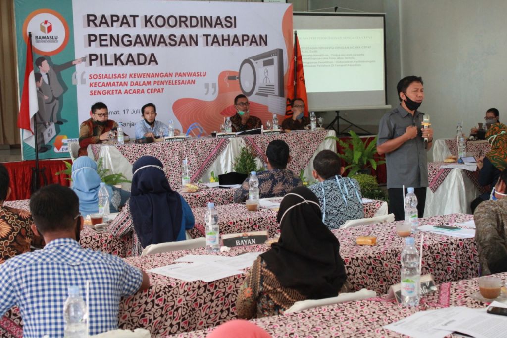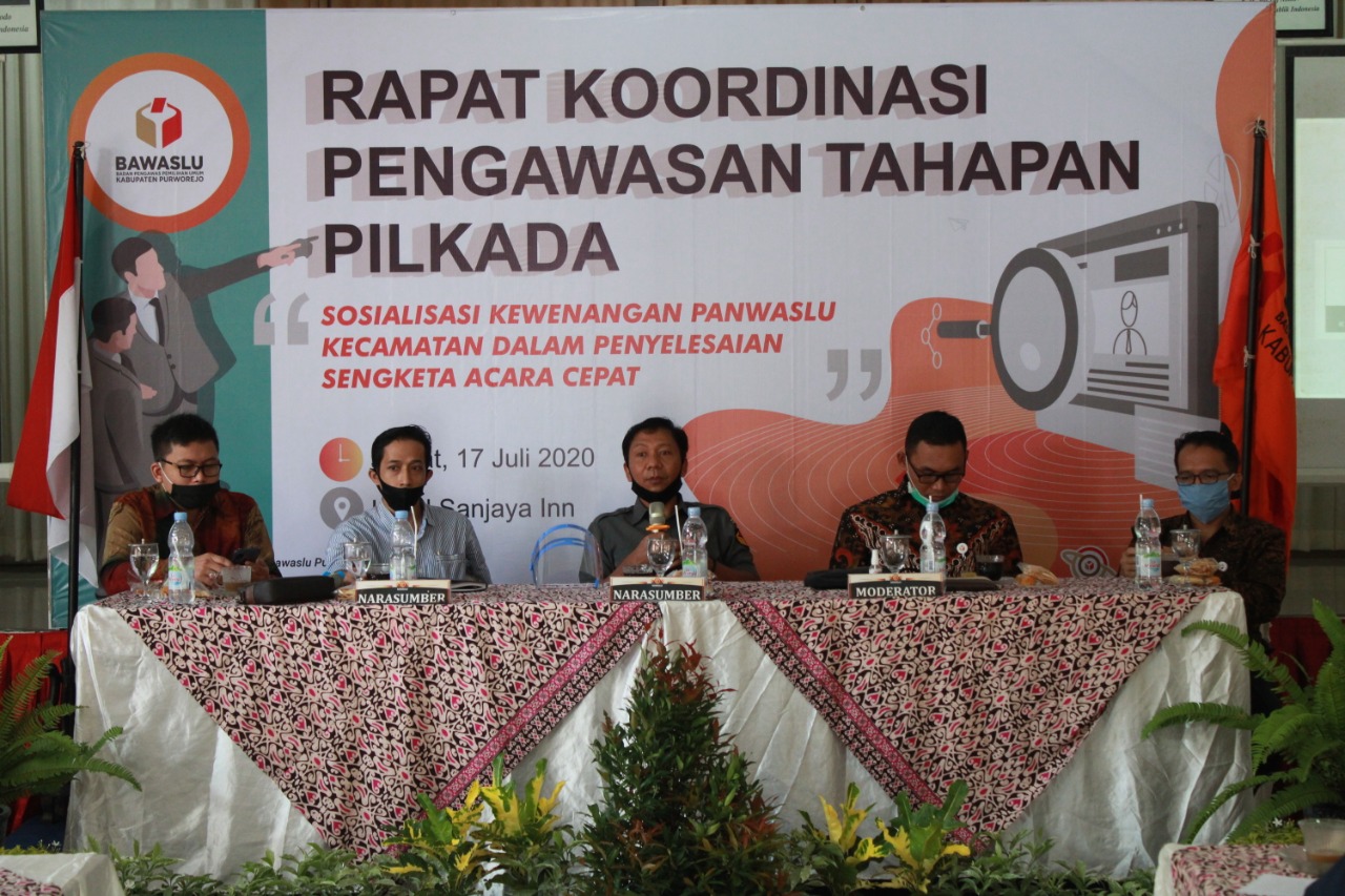 Untuk memberikan pemahaman dan menyiapkan kemampuan, Bawaslu Purworejo menggelar rapat koordinasi dengan materi tata cara penyelesaian sengketa dengan acara cepat. Rapat di hadiri anggota Panwaslu kecamatan se Kabupaten Purworejo, pada Jumat (17/7/2020).