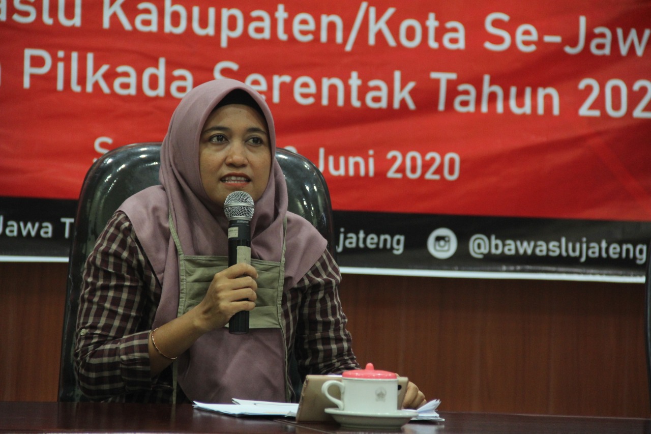 SEMARANG - Anggota Bawaslu Prov Jawa Tengah Anik Solihatun memberikan arahan kepada 21 Bawaslu Kab/Kota dalam acara Rapat Koordinasi Persiapan Pengawasan Tahapan secara daring Selasa pagi (9/6/2020).