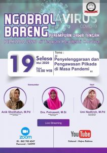 Acara tersebut bertema: "Penyelenggaraan dan Pengawasan Pilkada di Masa Pandemi" yang diselenggarakan Lembaga Kajian Pemberdayaan Perempuan dan Anak (LKP2A) Pati, Selasa (19 Mei 2020). Anik menyatakan pihaknya tanpa bermaksud berperspektif pesimis tapi persoalan ini harus diantisipasi.