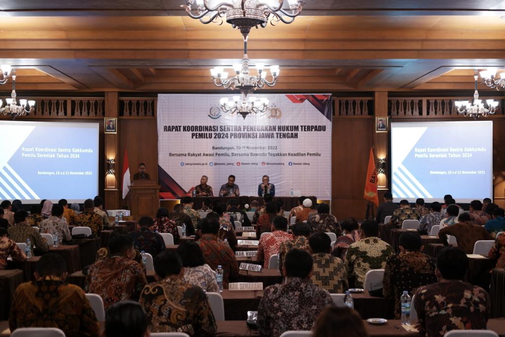 Ungaran - Bawaslu Jawa Tengah beserta kepolisian daerah Jawa Tengah dan Kejaksaan Jawa Tengah berkumpul membahas penyamaan persepsi dalam tahapan pemilu 2024 mendatang. Rapat koordinasi yang dihadiri seluruh Bawaslu kabupaten/kota, kasatreskrim Polres dan kasipidum kejaksaan negeri di 35 kabupaten/kota di Jawa Tengah yang nantinya akan tergabung menjadi sentra penegakan hukum terpadu (gakumdu) di Jawa Tengah membahas mengenai aturan awal sebagai dasar penanganan pelanggaran tahapan pemilu. Bertempat di salah satu hotel di Bandungan acara ini dihadiri langsung oleh pejabat utama dari masing-masing instansi. Rapat digelar pada 10-11 November 2022.